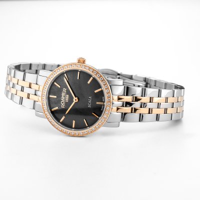 Este reloj marca Roamer tiene una caja de Inox con un diámetro de 28 mm y cuenta con una correa de Inox. Dentro de la caja se encuentra un mecanismo de Ronda de alta calidad el cual esta protegido por un cristal Zafiro.