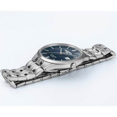 Este reloj marca Roamer tiene una caja de Inox con un diámetro de 40 mm y cuenta con una correa de Inox. Dentro de la caja se encuentra un mecanismo de Ronda de alta calidad el cual esta protegido por un cristal Zafiro.