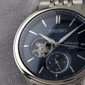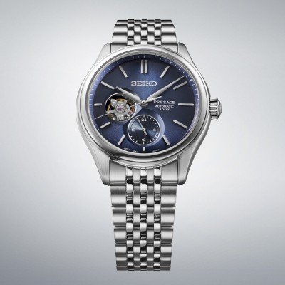 Los relojes de la serie Seiko Presage Classic Open heart tienen esferas curvas ricamente texturizadas, inspiradas en el tacto suave y flexible de los tejidos naturales cuyo uso está entretejido en la cultura japonesa. La serie presenta dos configuraciones de esfera y conjuntos de funciones diferentes. Con su curvatura y sus intrincados patrones texturizados, las esferas capturan y reflejan la luz ambiental para crear una mayor sensación de profundidad y belleza. La parte superior de los índices se curva para adaptarse a la forma redondeada de la esfera, y las agujas de los minutos y los segundos se inclinan suavemente hacia los marcadores. Una correa multifila de nuevo desarrollo con un diseño inspirado en la década de 1970 proporciona una sensación delicada y cómoda en la muñeca. La última incorporación a la popular serie de relojes es este reloj llamado "Ai-iro" por su esfera índigo. El añil fue un color muy apreciado durante el periodo Edo de Japón, entre 1603 y 1868, ya que se consideraba "la suerte de los samuráis". Durante la era Meiji (1868-1912), cuando Japón se estaba abriendo a Occidente, las ciudades se cubrían de este color, lo que hizo que los extranjeros que lo visitaban por primera vez empezaran a llamarlo "azul Japón". La paleta de colores de la serie también incluye el shiro-iro, el color de la tela natural sin blanquear, que inspira dos esferas de la colección; el sensai-cha, un marrón verdoso tenue que estuvo de moda durante el Periodo Edo; el arai-gaki, un color caqui lavado y blanqueado; y el sumi-iro, un negro grisáceo utilizado originalmente en las prendas que llevaban los monjes.