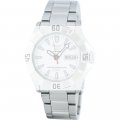 Esta correa de reloj de la :marca está hecha de acero inoxidable y se adjunta al reloj mediante pasadores de resorte. La banda tiene un ancho de 22 mm y se cierra mediante un cierre desplegable con botones pulsadores. La correa no tiene montura recta, lo que significa que esta correa sólo es adecuada para los relojes que se indican a continuación.