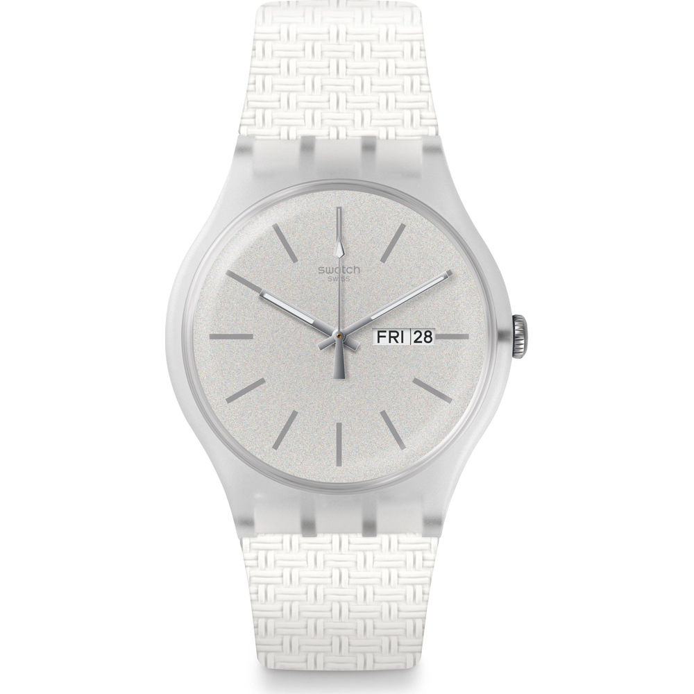 Este reloj marca Swatch tiene una caja de plástico con un diámetro de 41 mm y cuenta con una correa de Plástico /resina. Dentro de la caja se encuentra un mecanismo de Cuarzo de alta calidad el cual esta protegido por un cristal plexiglás.