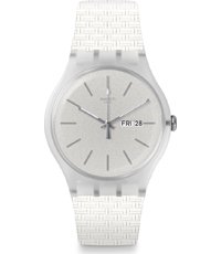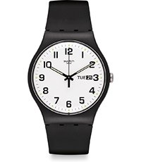 Este reloj marca Swatch tiene una caja de plástico con un diámetro de 41 mm y cuenta con una correa de Plástico /resina. Dentro de la caja se encuentra un mecanismo de Cuarzo de alta calidad el cual esta protegido por un cristal plexiglás.