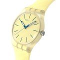 Este reloj marca Swatch tiene una caja de Plástico de origen biológico con un diámetro de 41 mm y cuenta con una correa de Goma. Dentro de la caja se encuentra un mecanismo de ETA de alta calidad el cual esta protegido por un cristal Acrílico.