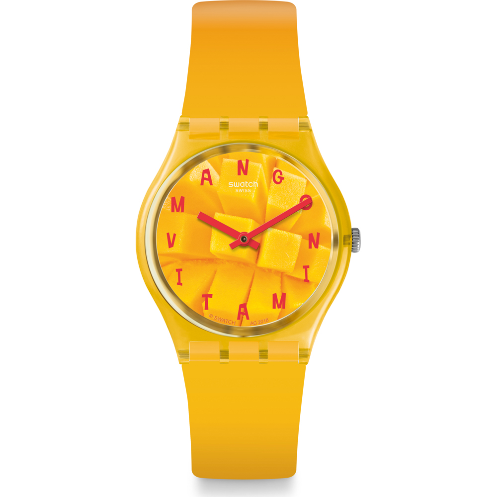 Este reloj marca Swatch tiene una caja de plástico con un diámetro de 34 mm y cuenta con una correa de Goma. Dentro de la caja se encuentra un mecanismo de Cuarzo de alta calidad el cual esta protegido por un cristal plexiglás.