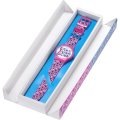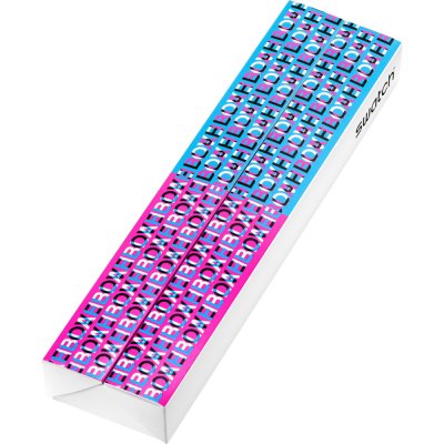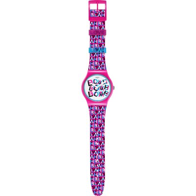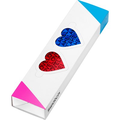 Este reloj Special presenta una esfera blanca con las palabras «LOVE» y «BLAH» impresas en rosa, negro y azul. Al observarlo a través de un cristal tintado en rojo o azul, verá una palabra diferente en la esfera.