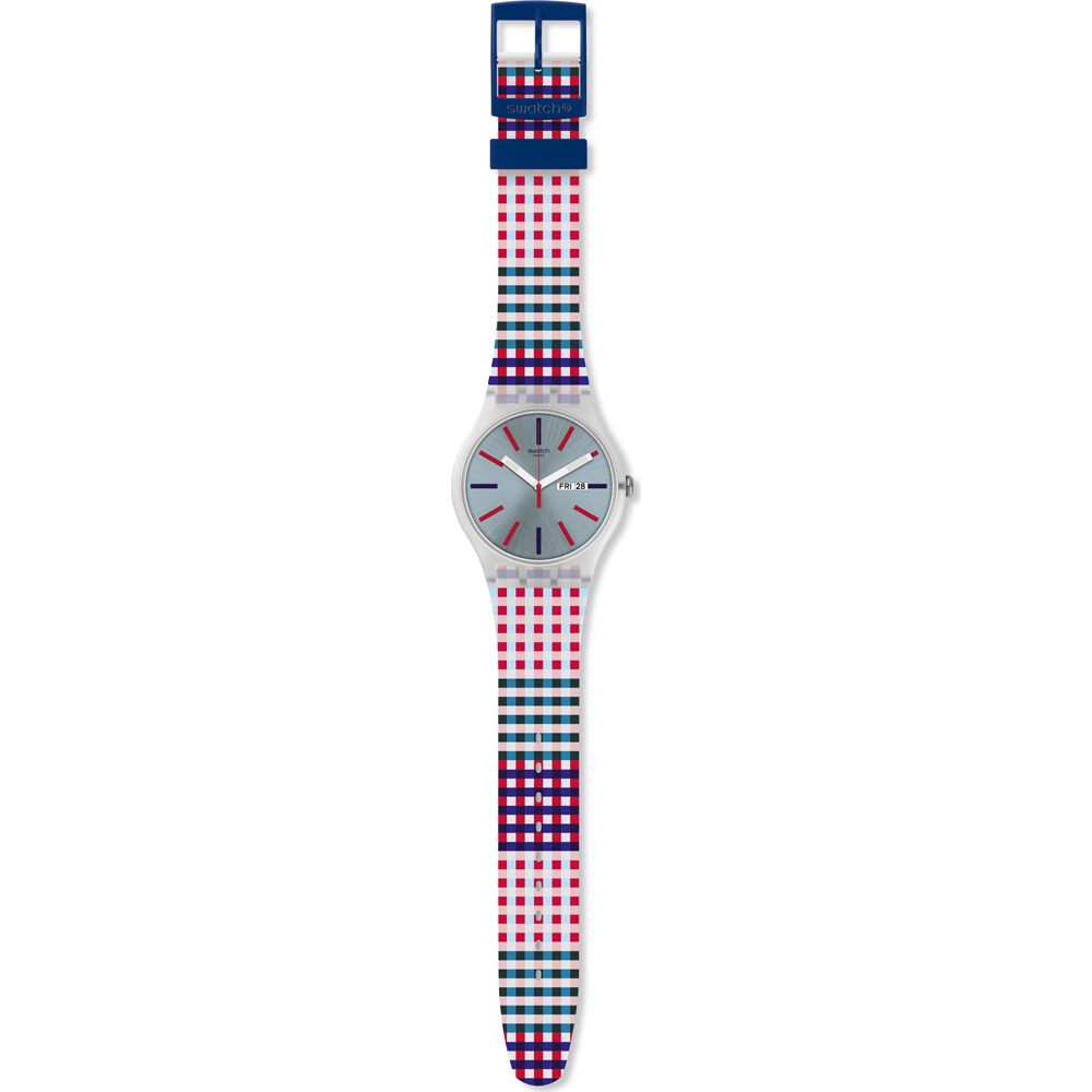 Este reloj marca Swatch tiene una caja de plástico con un diámetro de 41 mm y cuenta con una correa de Goma. Dentro de la caja se encuentra un mecanismo de Cuarzo de alta calidad el cual esta protegido por un cristal plexiglás.