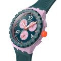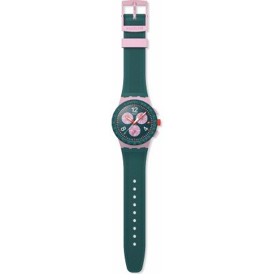 Este reloj marca Swatch tiene una caja de Resina con un diámetro de 41 mm y cuenta con una correa de Goma. Dentro de la caja se encuentra un mecanismo de ETA de alta calidad el cual esta protegido por un cristal Acrílico.