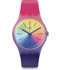 Este reloj marca Swatch tiene una caja de plástico con un diámetro de 41 mm y cuenta con una correa de Plástico /resina. Dentro de la caja se encuentra un mecanismo de Cuarzo de alta calidad el cual esta protegido por un cristal plexiglás.