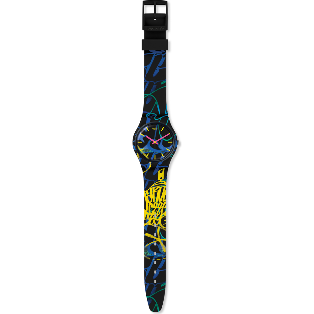 Este reloj marca Swatch tiene una caja de plástico con un diámetro de 34 mm y cuenta con una correa de Goma. Dentro de la caja se encuentra un mecanismo de Cuarzo de alta calidad el cual esta protegido por un cristal plexiglás.