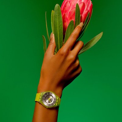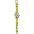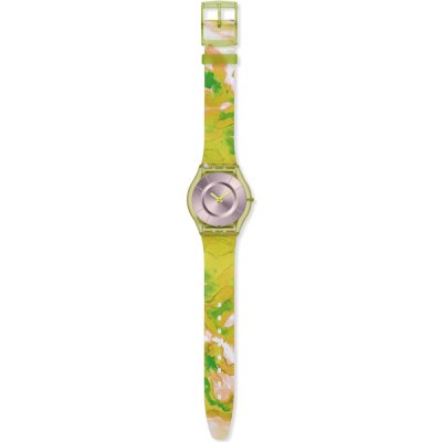 Este reloj marca Swatch tiene una caja de Plástico de origen biológico con un diámetro de 33.7 mm y cuenta con una correa de Goma. Dentro de la caja se encuentra un mecanismo de ETA de alta calidad el cual esta protegido por un cristal Acrílico.