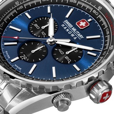 Este reloj marca Swiss Military Hanowa tiene una caja de Inox con un diámetro de 44 mm y cuenta con una correa de Inox. Dentro de la caja se encuentra un mecanismo de Ronda de alta calidad el cual esta protegido por un cristal Zafiro.