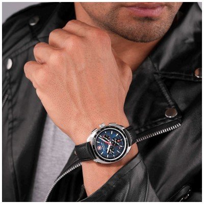 Este reloj marca Swiss Military Hanowa tiene una caja de Inox con un diámetro de 41 mm y cuenta con una correa de piel. Dentro de la caja se encuentra un mecanismo de Ronda de alta calidad el cual esta protegido por un cristal Zafiro.