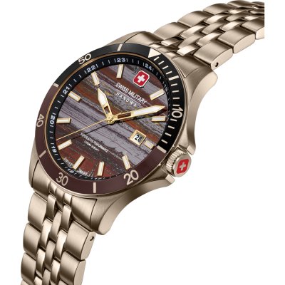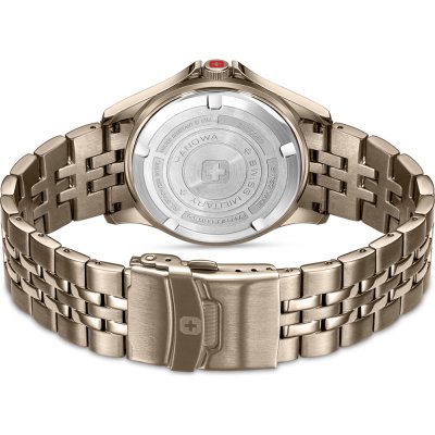 El reloj es resistente al agua hasta 10 ATM. Esto significa que el reloj es adecuado para nadar. El reloj viene con Swiss Military 3+2.