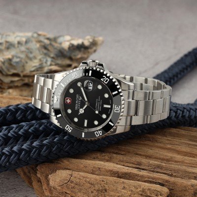 El reloj es resistente al agua hasta 20 ATM. Esto significa que el reloj es apto para el buceo. El reloj viene con Swiss Military 3+2.