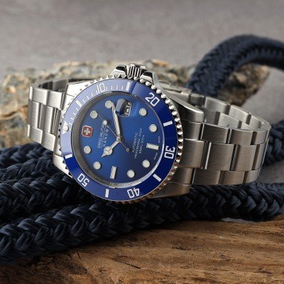 El reloj es resistente al agua hasta 20 ATM. Esto significa que el reloj es apto para el buceo. El reloj viene con Swiss Military 3+2.