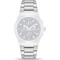 Esta correa de reloj de la :marca está hecha de acero inoxidable y se adjunta al reloj mediante pasadores de acero. La banda tiene un ancho de 26 mm y se cierra mediante un cierre desplegable con botones y seguridad. La correa no tiene montura recta, lo que significa que esta correa sólo es adecuada para los relojes que se indican a continuación.
