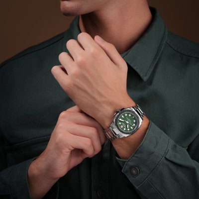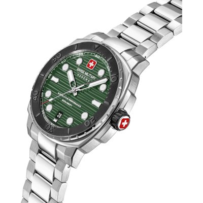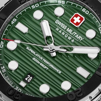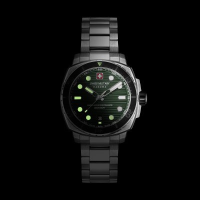 El reloj es resistente al agua hasta 20 ATM. Esto significa que el reloj es apto para el buceo. El reloj viene con Swiss Military 3+2.