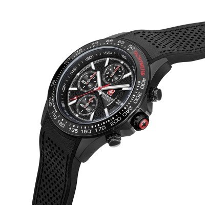 Este reloj marca Swiss Military Hanowa tiene una caja de Inox con un diámetro de 43 mm y cuenta con una correa de Goma. Dentro de la caja se encuentra un mecanismo de Ronda de alta calidad el cual esta protegido por un cristal Zafiro.