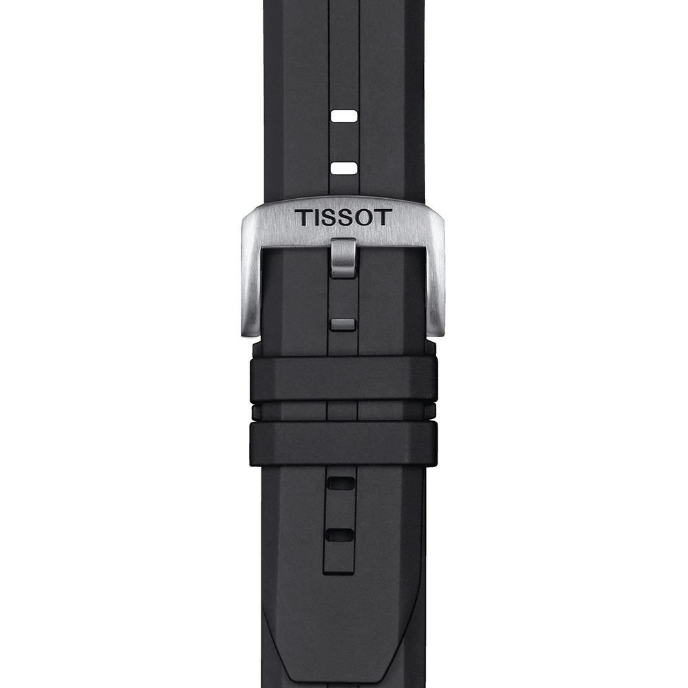 Este reloj marca Tissot tiene una caja de Titanio con un diámetro de 47.5 mm y cuenta con una correa de Goma. Dentro de la caja se encuentra un mecanismo de Tissot de alta calidad el cual esta protegido por un cristal Zafiro.