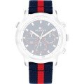Esta correa de reloj de la :marca está hecha de textil y se adjunta al reloj mediante pasadores de resorte. La banda tiene un ancho de 22 mm y se cierra mediante un hebilla. La correa tiene una montura recta, lo que significa que esta correa es adecuada para todos los relojes de la Tommy Hilfiger con montura recta.