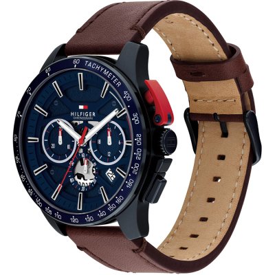 Este reloj marca Tommy Hilfiger tiene una caja de Inox con un diámetro de 44 mm y cuenta con una correa de piel. Dentro de la caja se encuentra un mecanismo de Seiko Instruments Inc. de alta calidad el cual esta protegido por un cristal Mineral.