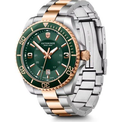 Este reloj marca Victorinox tiene una caja de Inox con un diámetro de 43 mm y cuenta con una correa de Inox. Dentro de la caja se encuentra un mecanismo de Ronda de alta calidad el cual esta protegido por un cristal Zafiro.